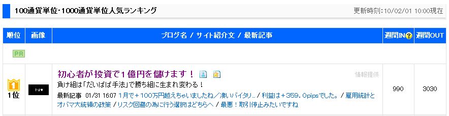 ブログ村の「100通貨単位・1000通貨単位」にて第1位に成れました!